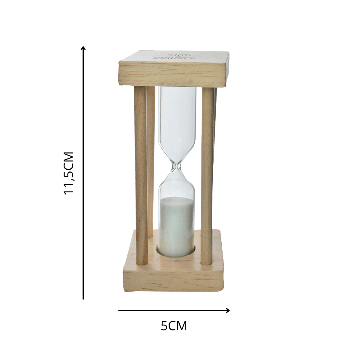 O corpo em vidro transparente permite visualizar a passagem da areia com leveza, enquanto a base em madeira natural adiciona um toque rústico e sofisticado ao ambiente. Uma peça versátil que une utilidade e estética.