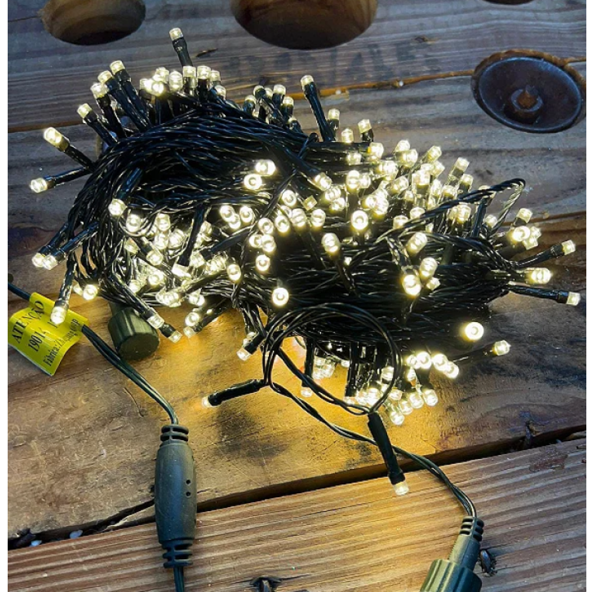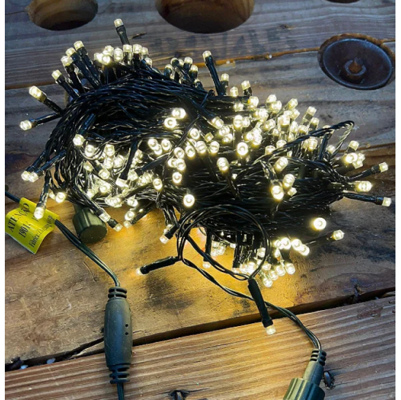 Cordão de Led com 300 lâmpadas de Led fixo (não possui opção de piscar) na cor branco quente (amarelada). Pode ser usada para diversos tipos de decoração, desde decorações natalinas até o uso em festas de aniversários ou casamento.