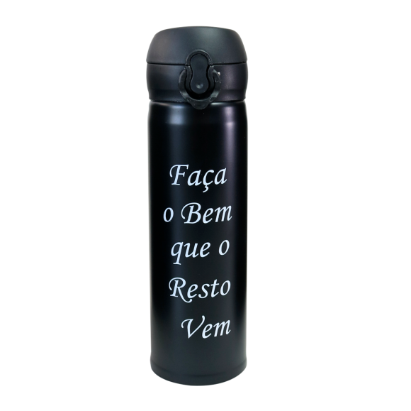 Pode ser usado tanto em bebidas quentes quanto em geladas. Sistema de fechamento que impede vazamentos. Bocal mais largo para acomodar cubos de gelo. Possui design arrojado. Frase "Faça o Bem que o Resto Vem."