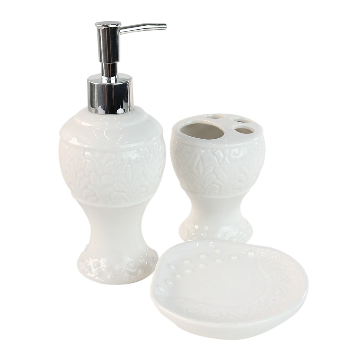 O toque que faltava na decoração do seu banheiro. O Jogo possui três peças confeccionadas em porcelana com design diferencial na peça trabalhada.