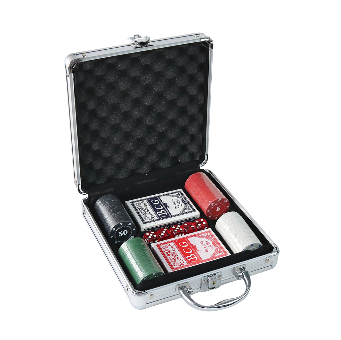 A maleta de Poker com chave é um conjunto completo para os amantes do jogo de cartas. Feita de material durável, como alumínio resistente, a maleta possui um acabamento elegante e vem com uma chave para travá-la, garantindo a segurança e a privacidade dos componentes internos. O conjunto também contém cinco dados que são usados para jogar diferentes variações de poker ou outros jogos. Eles são feitos de plástico e têm um tamanho padrão. A maleta contém 100 fichas de poker (25 de cada) e têm diferentes denominações, permitindo que os jogadores façam apostas em valores variados. Além disso o conjunto inclui dois baralhos completos de 52 cartas cada um. Os baralhos são feitos de papel de alta qualidade, com um acabamento suave e deslizante, permitindo uma fácil distribuição e manuseio das cartas. As faces das cartas têm designs clássicos e detalhados, facilitando a identificação de cada carta.