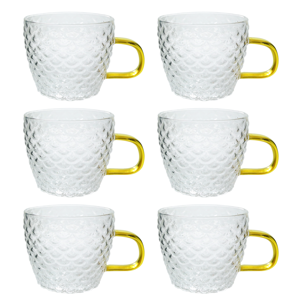 Um conjunto de xícaras transparentes com 6 peças apresenta uma elegância sutil e moderna. Cada xícara é confecionada em material transparente de alta qualidade, proporcionando uma visão clara do conteúdo interno. A transparência destas xícaras adiciona um toque contemporâneo à experiência de servir e apreciar a bebida.