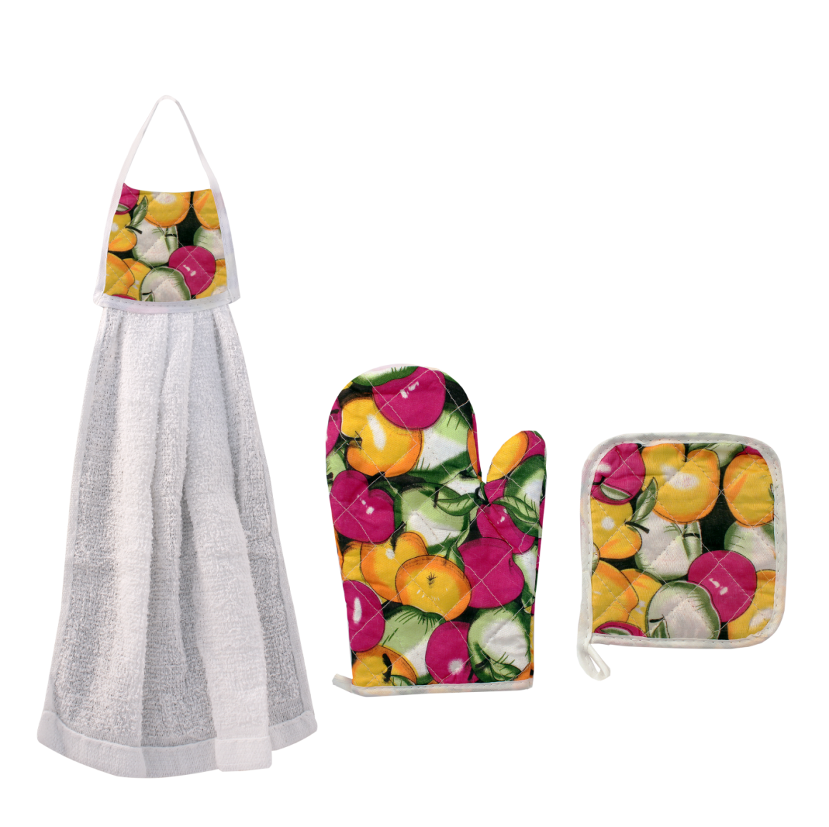 KIT LUVA PARA FORNO, DESCANSO DE PANELA E PANO DE COPA 03 PEÇAS SORTIDAS - CA04067-A