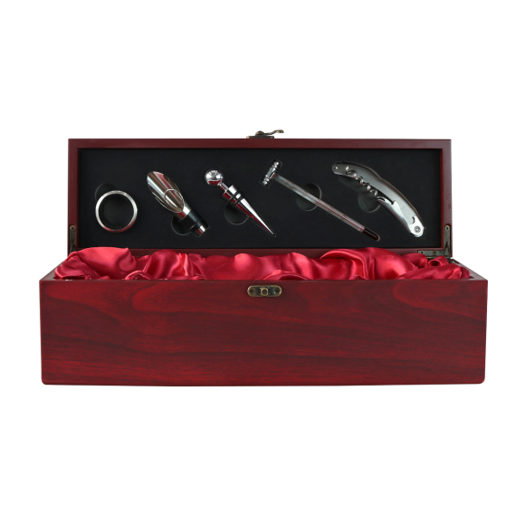 KIT VINHO COM 5 ACESSÓRIOS NO ESTOJO PORTA VINHO DE MADEIRA 36CM - MG5404