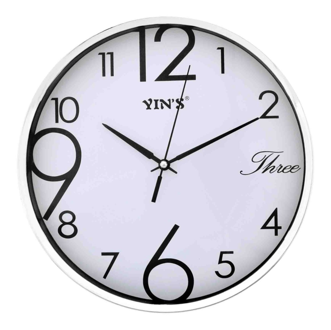 Relógio de parede com números grandes para facilitar a visualização, bordas prateadas, ponteiro de segundos contínuo.