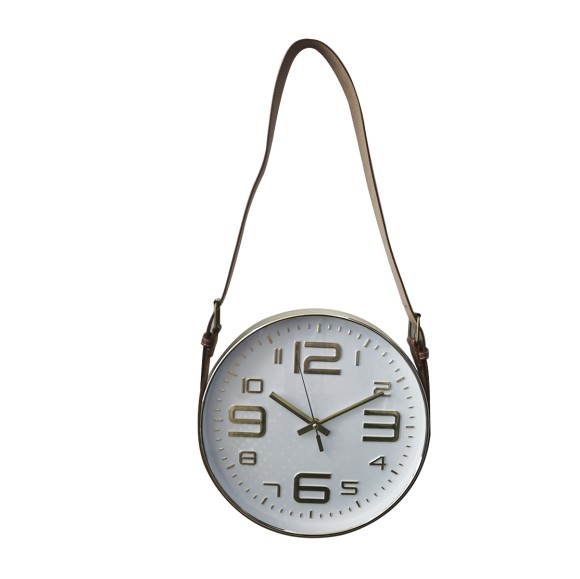 RELOGIO DE PAREDE COM ALÇA EM COURO SINTÉTICO COM AJUSTES.
