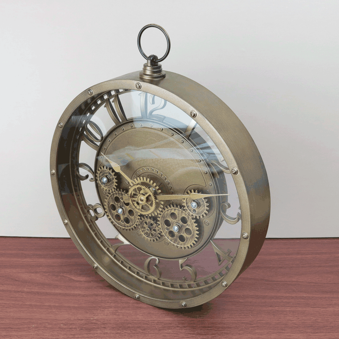 O design imponente, somado ao visual mecânico das engrenagens, faz do relógio um destaque na parede, funcionando tanto como objeto decorativo quanto como ponto central da composição do espaço.